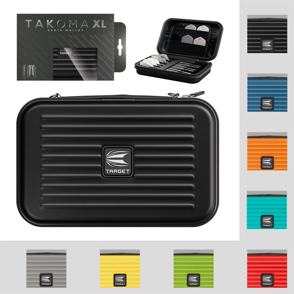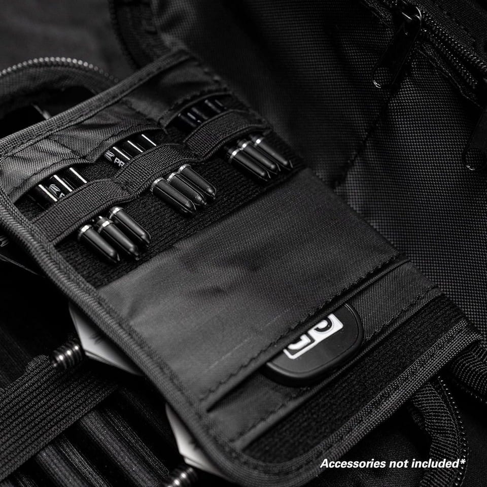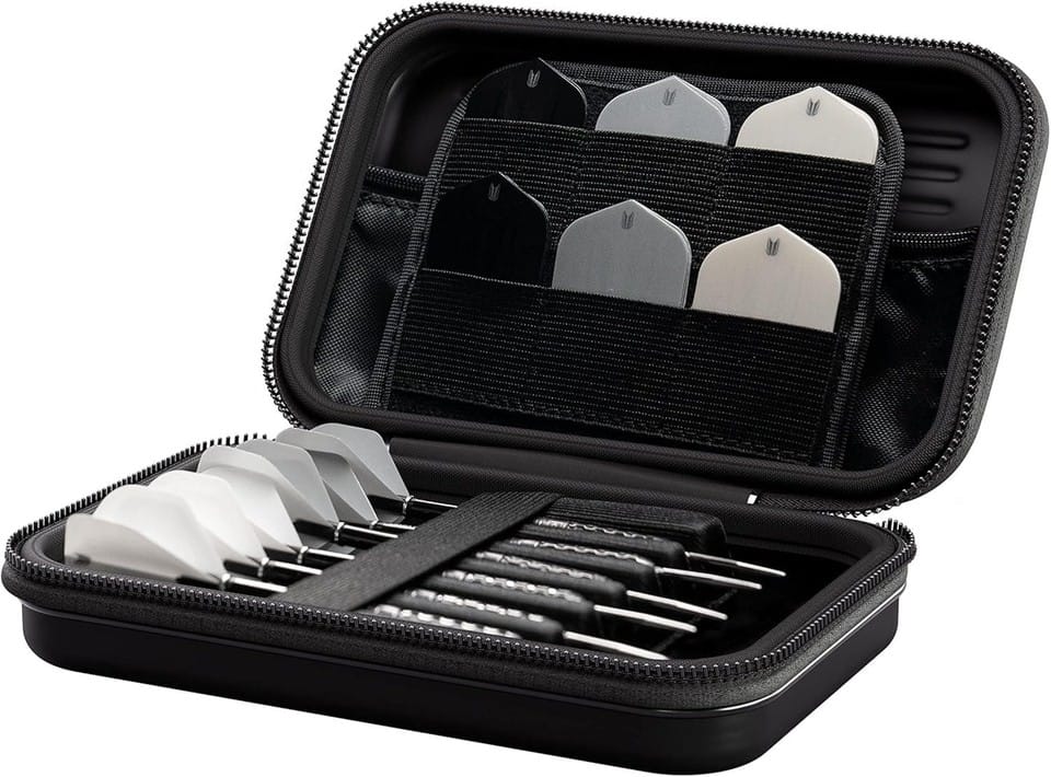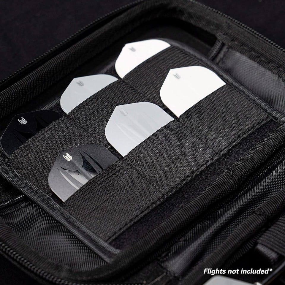 The Takoma XL by Target Darts. A strong EVA material is used to maintain rigidity and give protection to the darts and accessories inside. While inside the wallet a velvet layer has been added for a soft feel and to be scratch resistant. The darts themselves are held fully assembled with an elastic strap on top to prevent movement inside. The wallet is thick enough to ensure the flights don’t become crush. Also inside the case are two zip locked pouches to hold spare accessories.