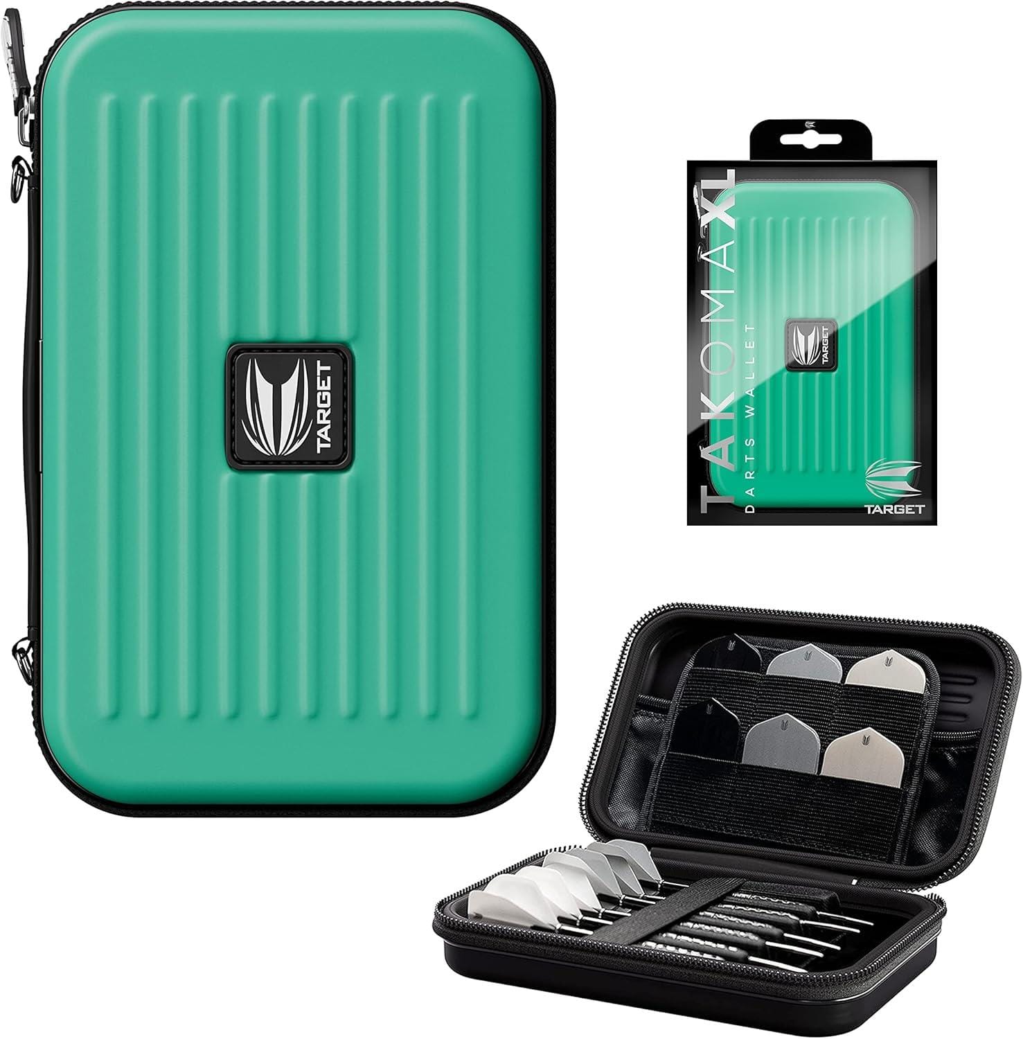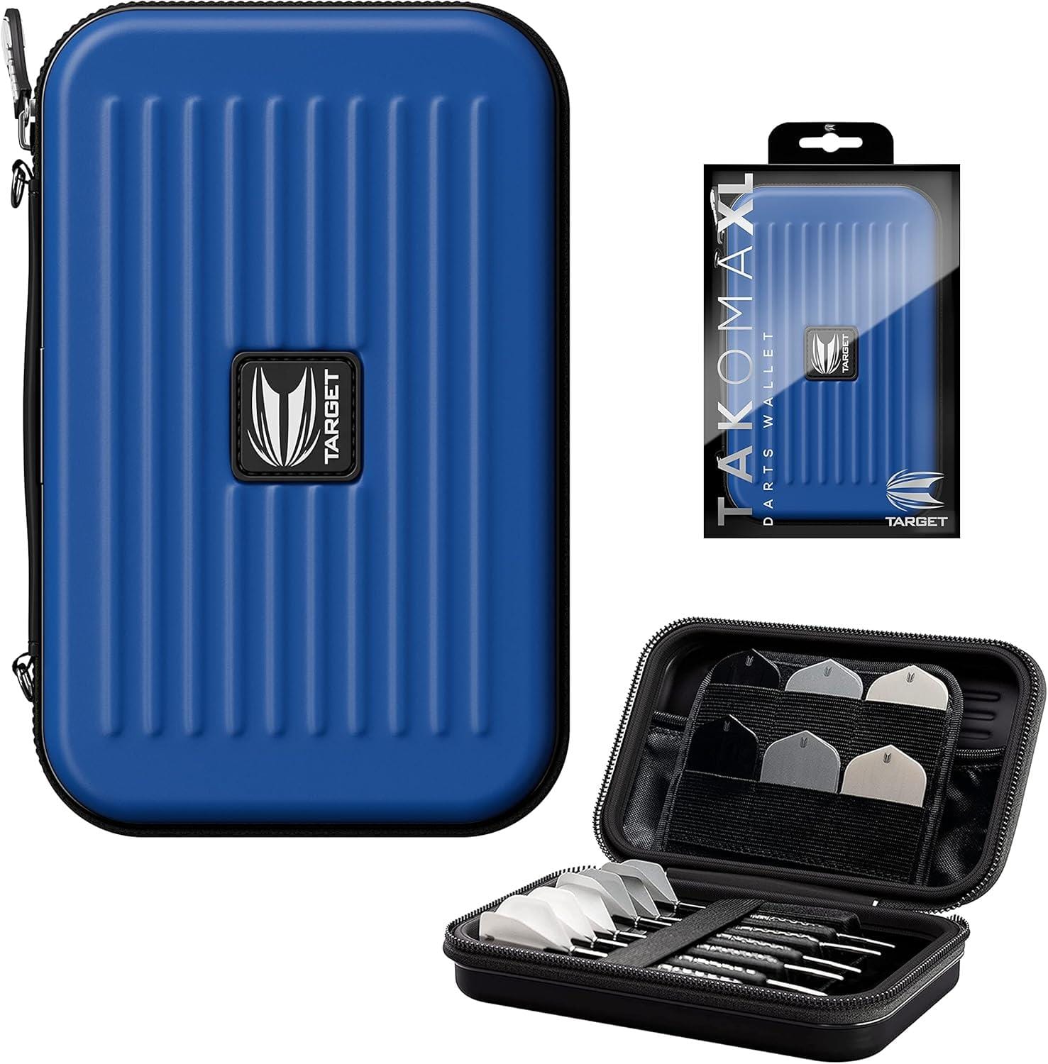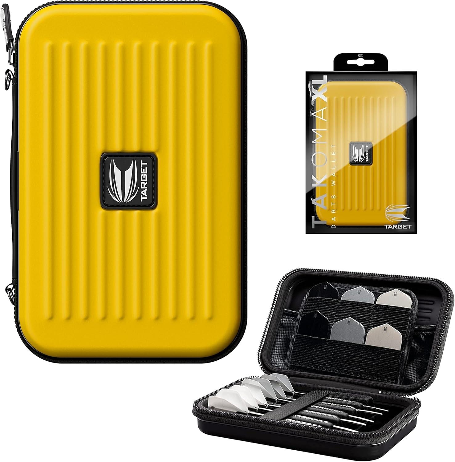 The Takoma XL by Target Darts. A strong EVA material is used to maintain rigidity and give protection to the darts and accessories inside. While inside the wallet a velvet layer has been added for a soft feel and to be scratch resistant. The darts themselves are held fully assembled with an elastic strap on top to prevent movement inside. The wallet is thick enough to ensure the flights don’t become crush. Also inside the case are two zip locked pouches to hold spare accessories.